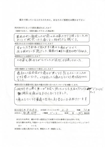 首から左手全体で指の先まで痛みと痺れがひどく、夜も寝れない状態でした。